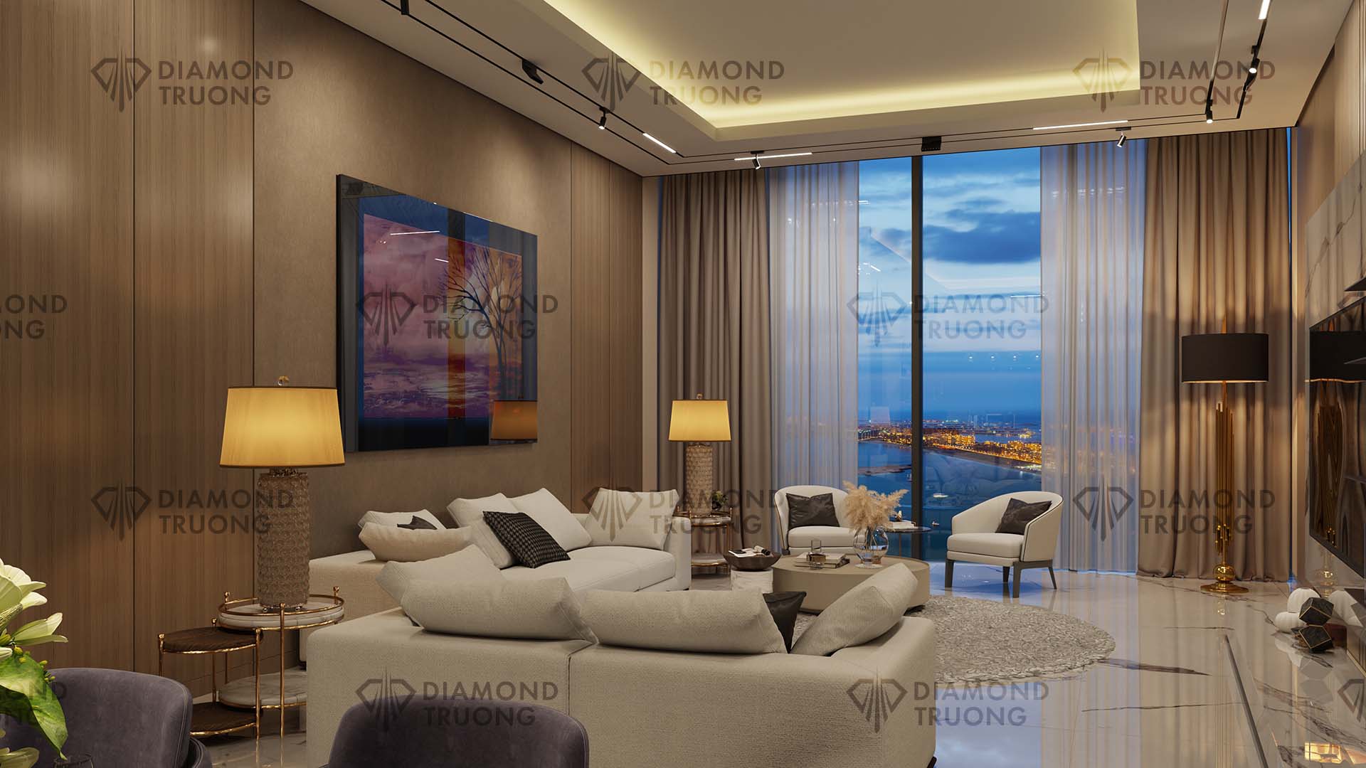Experience refined comfort in a bright, spacious living area that blends contemporary design with panoramic city and golf course views.